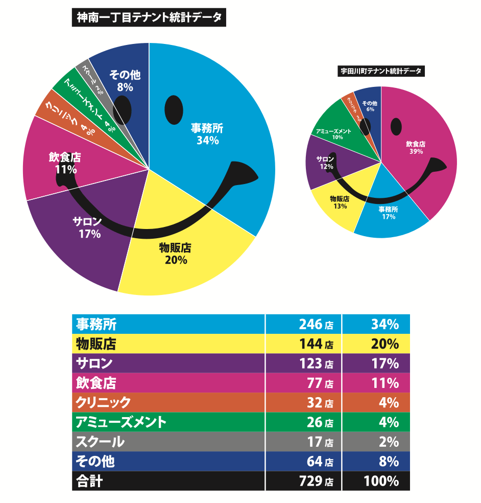 神南一丁目の121棟の建物、729区画のテナントを調査しました。なかなか面白い結果となっておりますので是非ご覧ください。また前回お知らせした宇田川町のデータも掲載しますので見比べてみてください!